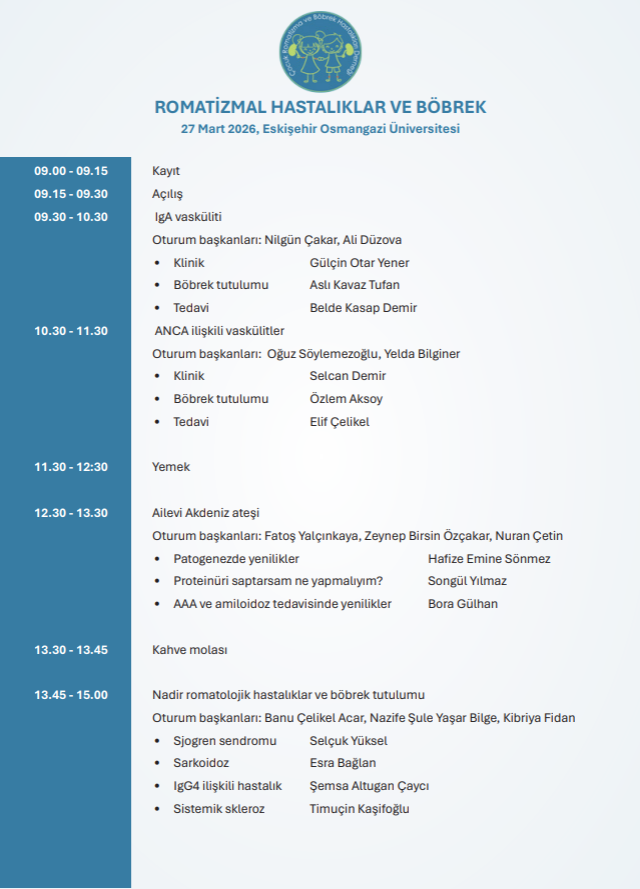 Çocuk Romatizma ve Böbrek Hastalıkları Derneğinin 3. genel kurulu 27 Haziran 2025, saat 12:00'da AÜTF Çocuk Sağlığı ve Hastalıkları Anabilim Dalı Akademik Kurul Salonunda, yeterli çoğunluk sağlanamadığı takdirde 07 Temmuz 2025'de aynı yer ve saatte yapılacaktır.