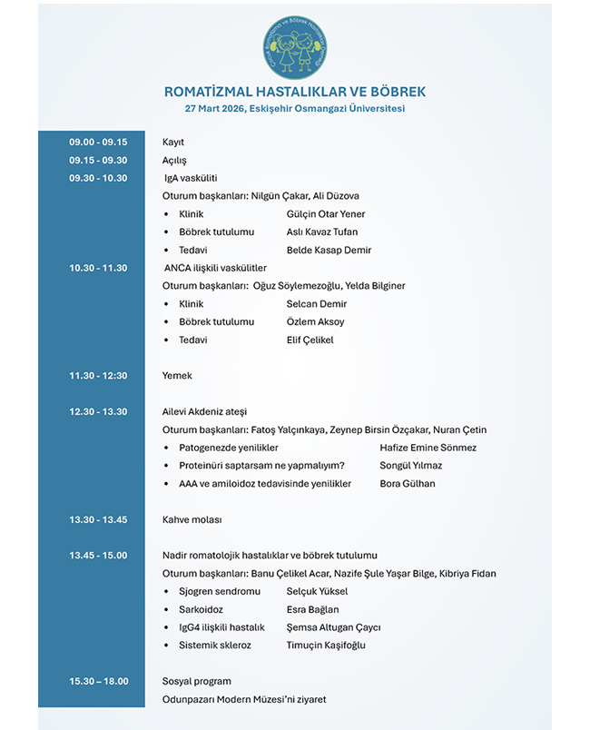 Çocuk Romatizma ve Böbrek Hastalıkları Derneğinin 3. genel kurulu 27 Haziran 2025, saat 12:00'da AÜTF Çocuk Sağlığı ve Hastalıkları Anabilim Dalı Akademik Kurul Salonunda, yeterli çoğunluk sağlanamadığı takdirde 07 Temmuz 2025'de aynı yer ve saatte yapılacaktır.